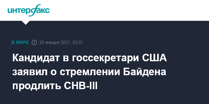 Кандидат на пост госсекретаря не смог ответить на вопрос о сроке, на который США попытаются продлить договор. По его словам, это определит Байден, когда приступит к работе в Белом доме.