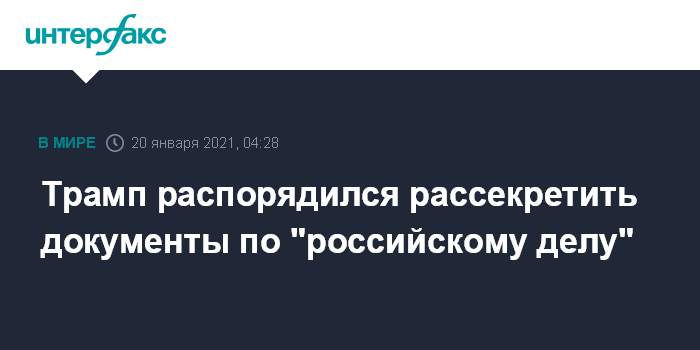 Москва. 20 января. INTERFAX.RU - Дональд Трамп в свой последний день на посту президента Соединенных Штатов распорядился рассекретить документы, связанные с расследованием ФБР о предполагаемых связях предвыборного штаба Трампа с Россией, сообщает Белый дом.