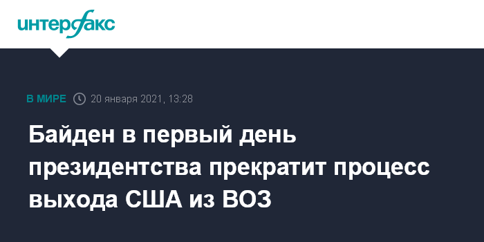 Москва. 20 января. INTERFAX.RU - Избранный президент США Джо Байден в день официального вступления в должность поставит подпись под указом, прекращающим процесс выхода Соединенных Штатов из Всемирной организации здравоохранения (ВОЗ), говорится в заявлении на сайте команды американского политика.