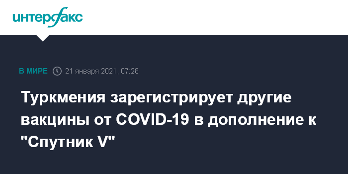 Москва. 21 января. INTERFAX.RU - Президент Туркмении поручил продолжить работу по регистрации вакцин от COVID-19 других стран в дополнение к уже зарегистрированной российской "Спутник V".