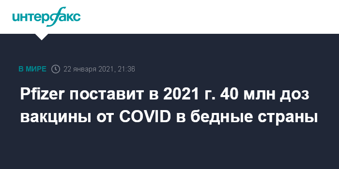 Москва. 22 января. INTERFAX.RU - Американская компания Pfizer взяла на себя обязательство поставить в 2021 году до 40 млн доз разработанной ею вакцины от коронавируса в бедные страны, а также страны со средним уровнем доходов в рамках инициативы ВОЗ COVAX. Об этом сообщает в пятницу агентство Associated Press.