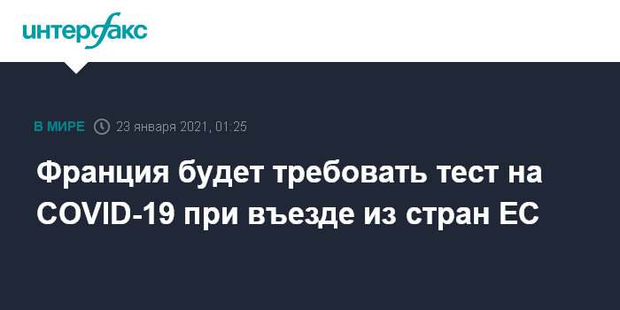 Москва. 23 января. INTERFAX.RU - Въезжающим во Францию из стран Евросоюза будет необходимо предварительно сдать тест на коронавирус COVID-19, сообщает Associated Press.