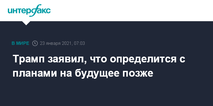 Москва. 23 января. INTERFAX.RU - Бывший президент США Дональд Трамп не стал делиться с журналистами своими планами на будущее, заявив, что займется этим потом, передает The Washington Examiner.