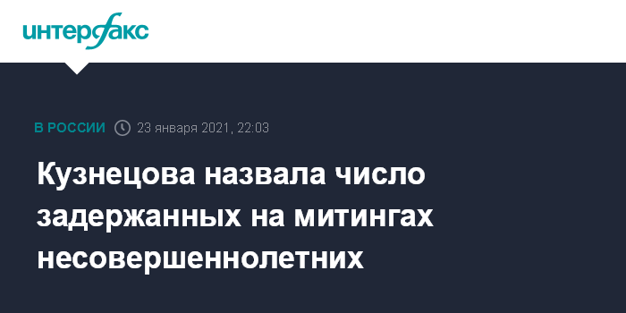 Москва. 23 января. INTERFAX.RU - Около 300 несовершеннолетних было задержано на несанкционированных акциях в России, из них около 70 – в Москве, сообщила уполномоченный при президенте РФ по правам ребенка Анна Кузнецова в своем фейсбуке.