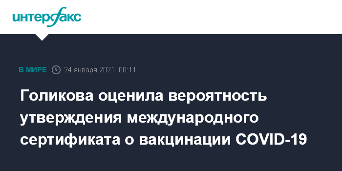 Москва. 24 января. INTERFAX.RU - Введение единого международного сертификата о вакцинации от коронавируса COVID-19 маловероятно, так как странам сложно договориться по этому вопросу, заявила вице-премьер Татьяна Голикова.