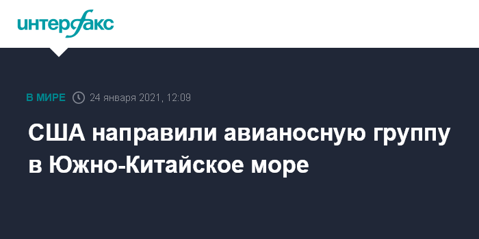 Москва. 24 января. INTERFAX.RU - Пентагон накануне отправил в Южно-Китайское море авианосную ударную группу во главе с авианосцем "Теодор Рузвельт" (USS Theodore Roosevelt) - в тот же день, когда власти Тайваня заявили о полете 12 самолетов ВВС КНР в районе острова, сообщает в воскресенье газета The Japan Times.