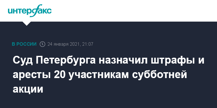Москва. 24 января. INTERFAX.RU - Красносельский районный суд Санкт-Петербурга рассмотрел 20 административных протоколов в отношении участников несанкционированной акции в поддержку оппозиционера Алексея Навального.