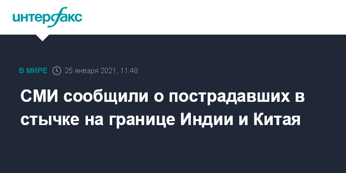 Москва. 25 января. INTERFAX.RU - В столкновении на индийско-китайской границе, которое произошло 20 января в Северном Сиккиме, были ранены четверо индийских военнослужащих и не менее 20 китайских военных, пишет India Today со ссылкой на источники. Представитель ВС Индии сообщил, что небольшое столкновение было урегулировано офицерами.