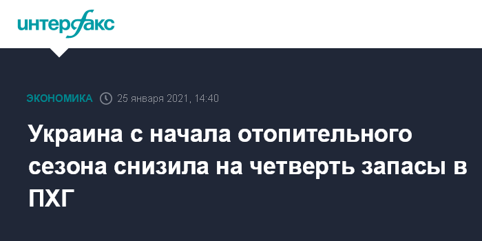Москва. 25 января. INTERFAX.RU - Украина с 19 октября 2020 года по 23 января 2021 года снизила запасы природного газа в подземных хранилищах (ПХГ) на 23,7% (на 6,732 млрд куб. м) – до 21,711 млрд куб. м, свидетельствуют оперативные данные АО "Укртрансгаз".