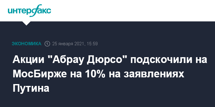 Москва. 25 января. INTERFAX.RU - Акции "Абрау Дюрсо" подскочили в ходе торгов на Московской бирже в понедельник на 10% (до 220 рублей за штуку) на заявлениях президента РФ Владимира Путина о своем советнике Борисе Титове, являющемся владельцем компании.