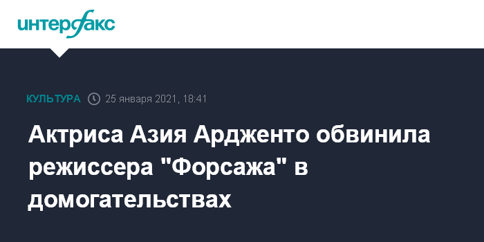 Москва. 25 января. INTERFAX.RU - Итальянская актриса Азия Ардженто заявила, что подверглась сексуальным домогательствам со стороны американского режиссера Роба Коэна. Она подтвердила эти заявления в комментарии для Variety, ранее она высказала обвинения в Il Corriere della Sera и других итальянских СМИ.