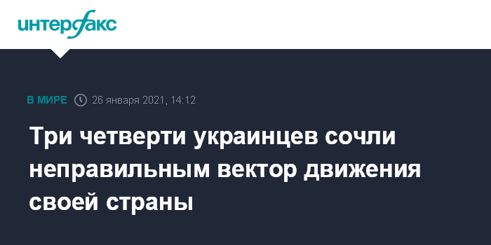 Москва. 26 января. INTERFAX.RU - Почти три четверти жителей Украины высказали мнение, что их страна движется в неправильном направлении. Об этом свидетельствуют результаты опроса Киевского международного института социологии (КМИС).