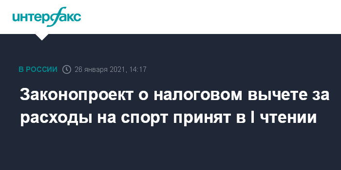 Москва. 26 января. INTERFAX.RU - Госдума приняла в первом чтении поправки в Налоговый кодекс (НК) РФ, которые позволяют гражданам получить налоговый вычет по НДФЛ при оплате услуг, связанных с физкультурой и спортом.