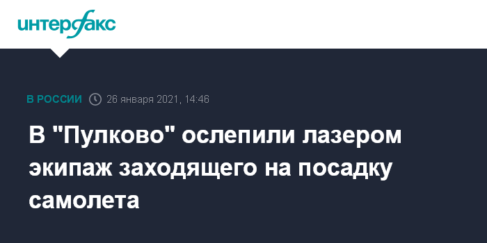 По предварительным данным, накануне, 25 января, вечером при посадке в аэропорту "Пулково" экипаж самолета авиакомпании "Руслайн", выполнявший рейс "Ханты-Мансийск - Санкт-Петербург", доложил, что его ослепили лазером зеленого цвета. Лайнер благополучно приземлился.