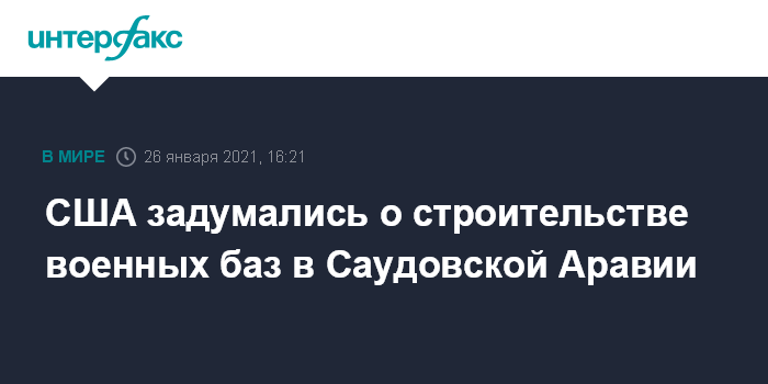 Москва. 26 января. INTERFAX.RU - Американские военнослужащие рассматривают возможность создания дополнительных военных баз на территории Саудовской Аравии на фоне напряженности в отношениях с Ираном, сообщает во вторник агентство Associated Press.