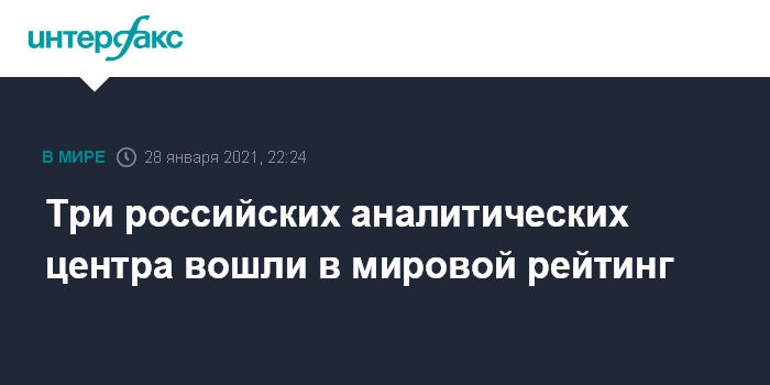 Москва. 28 января. INTERFAX.RU - Три российских аналитических центра – ИМЭМО РАН, Московский Центр Карнеги и МГИМО – вошли в авторитетный рейтинг Global Go To Think Tank Index Report Университета Пенсильвании за 2020 год.