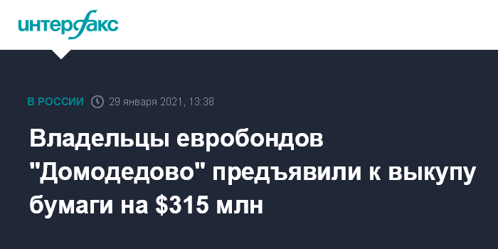 Москва. 29 января. INTERFAX.RU - Владельцы евробондов аэропорта "Домодедово" с погашением в 2021 и 2023 годах в рамках оферты предъявили к выкупу бумаги на общую сумму около $315 млн.