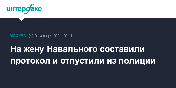 Москва. 31 января. INTERFAX.RU - Сотрудники полиции составили в отношении Юлии Навальной - супруги оппозиционера Алексея Навального - административный протокол об участии в несогласованной акции, повлекшей помехи для пешеходов и транспорта, и отпустили.