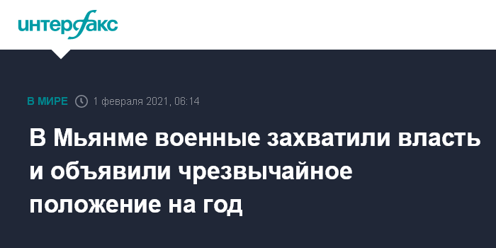 Как отмечается, военные заявили о переходе власти под их контроль сроком на один год. Диктор на телеканале Myawaddy TV, принадлежащем военным, объяснил захват власти неспособностью правительства Мьянмы должным образом отреагировать на заявления военных о фальсификациях на прошедших в ноябре выборах.