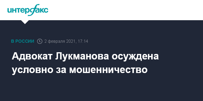 Москва. 2 февраля. INTERFAX.RU - Адвокат Ольга Лукманова приговорена к пяти годам условно по обвинению в мошенничестве на 4 млн рублей.