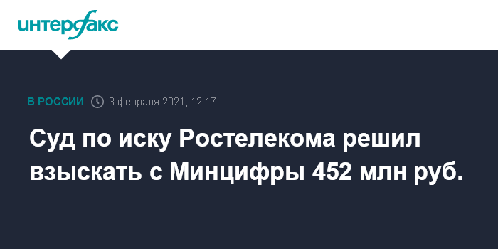 Москва. 3 февраля. INTERFAX.RU - Арбитражный суд Москвы 1 февраля частично удовлетворил иск ПАО "Ростелеком", решив взыскать с Минкомсвязи России 452,3 млн рублей из требуемых 469,9 млн рублей, следует из картотеки суда.