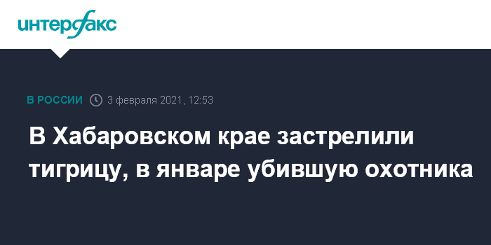 Москва. 3 февраля. INTERFAX.RU - Амурский тигр, убивший охотника в январе 2021 года, ликвидирован, сообщает региональное Минприроды.