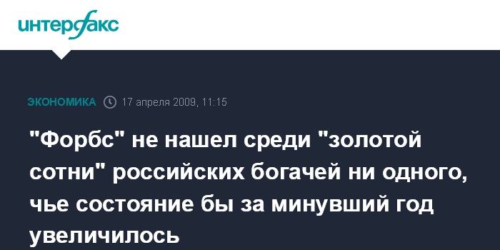 Москва. 17 апреля. INTERFAX.RU - Согласно данным журнала "Форбс" (Forbes), по сравнению с прошлым годом совокупное состояние первой сотни российских богачей уменьшилось на 380 млрд долларов и составляет сейчас $142 млрд.