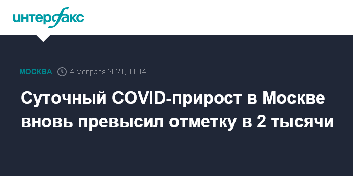 Москва. 4 февраля. INTERFAX.RU - Более 2 тысяч случаев заболевания COVID-19 выявили в Москве за последние сутки, что почти на 500 человек больше, чем накануне, следует из сообщения оперативного штаба по контролю за коронавирусом.