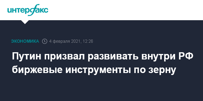 "Что касается рынка продовольственных товаров, в том числе зернового рынка, то, конечно, нам нужно задумываться об этом. У нас то же самое происходит на рынке энергоносителей. Мы одна из крупнейших стран-производителей, а ориентируемся на биржи, которые находятся за границами РФ", - сказал президент, комментируя предложение министра о необходимости срочного развития биржевой торговли по зерну внутри России.