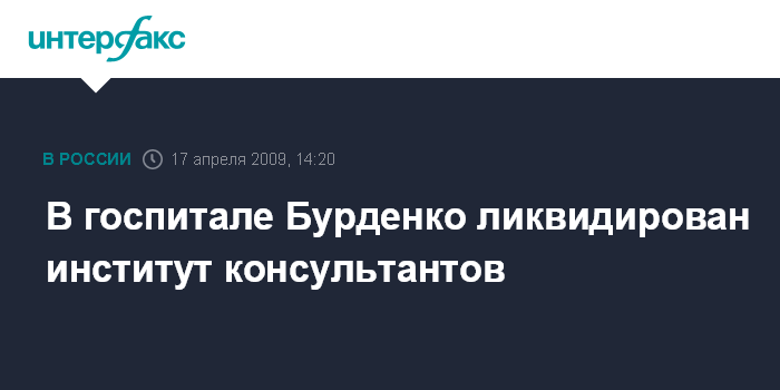Москва. 17 апреля. INTERFAX.RU - Институт консультантов - ведущих специалистов по оказанию высокотехнологической медпомощи упразднен в Главном военном клиническом госпитале (ГВКГ) имени академика Бурденко, сообщил "Интерфаксу" источник в российском военном ведомстве.