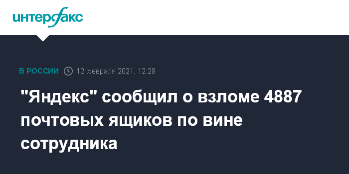 Москва. 12 февраля. INTERFAX.RU - Служба безопасности "Яндекса" обнаружила взлом 4887 почтовых ящиков пользователей "Яндекс.Почты" по вине сотрудника компании. Об этом сообщила пресс-служба "Яндекса".