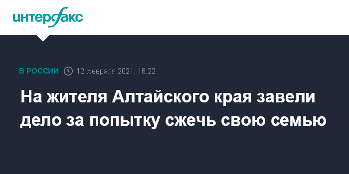 Москва. 12 февраля. INTERFAX.RU - Уголовное дело возбуждено в Алтайском крае в отношении 44-летнего жителя Михайловского района, который поджег свою гражданскую жену и комнату в доме, где находилась их двухлетняя дочь, сообщает в пятницу следственное управление СКР по региону.