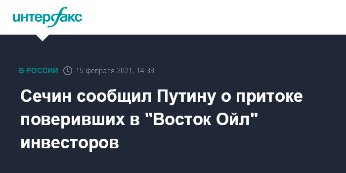 Сечин сообщил Путину о притоке поверивших в "Восток Ойл" инвесторов