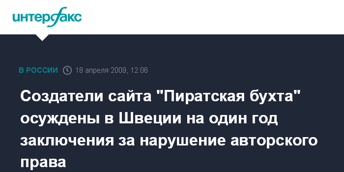 Москва. 18 апреля. INTERFAX.RU - Шведский суд приговорил создателей веб-сайта The Pirate Bay (Пиратская бухта), предоставляющего ссылки для обмена файлами по сети, к одному году лишения свободы и штрафу в размере $4,5 млн, сообщает в субботу британская телерадиокорпорация Би-Би-Си.