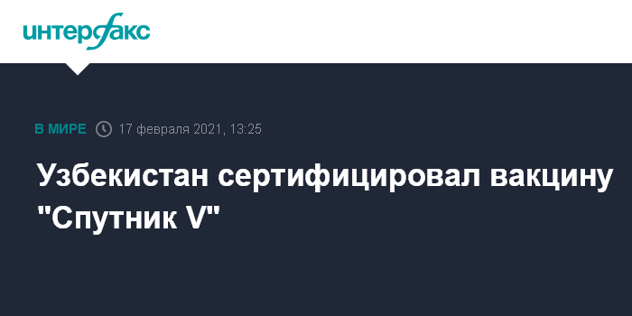 Москва. 17 февраля. INTERFAX.RU - В Узбекистане одобрена сертификация вакцины российской вакцины "Спутник V" от коронавируса и дано разрешение на ее массовое применение, сообщает в среду республиканская спецкомиссия по борьбе с COVID-19.