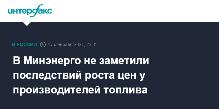 Москва. 17 февраля. INTERFAX.RU - Рост цен производителей нефтепродуктов, отмеченный Росстатом в январе 2021 года по сравнению с декабрем 2020 года, не оказывает существенного влияния на розничные цены в России, сказал "Интерфаксу" замминистра энергетики Павел Сорокин.