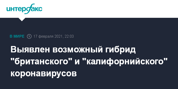 Москва. 17 февраля. INTERFAX.RU - В Калифорнии обнаружен возможный гибрид "британского" и "калифорнийского" коронавирусов SARS-CoV-2, представляющий значительно мутировавшую комбинацию геномов этих штаммов, пишет The New Scientist.