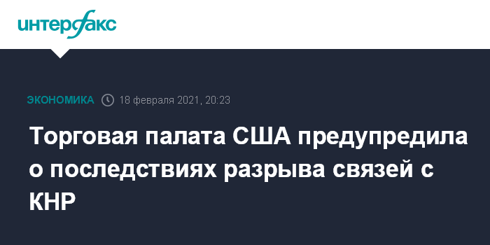 Москва. 18 февраля. INTERFAX.RU - Рост напряженности в отношениях с Китаем может иметь серьезные последствия для американских компаний и в худшем случае даже парализовать целые отрасли экономики, предупреждает Торговая палата США.