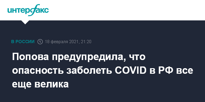 Москва. 18 февраля. INTERFAX.RU - В России удается сдерживать распространение коронавирусной инфекции, однако риски заразиться еще велики, сообщила глава Роспотребнадзора Анна Попова.