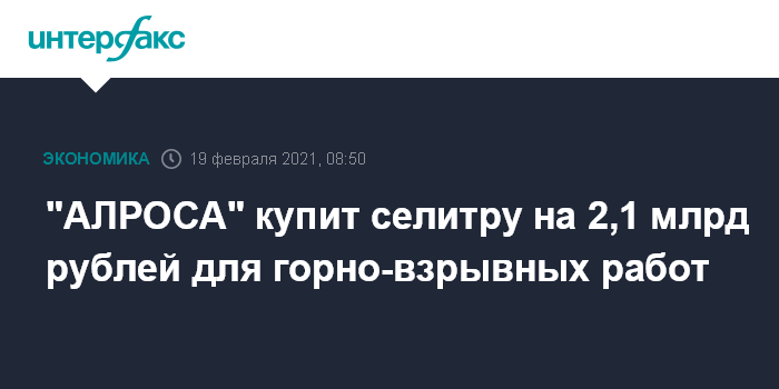 Москва. 19 февраля. INTERFAX.RU - Алмазная компания "АЛРОСА" объявила тендер на поставку селитры аммиачной марки "А" с начальной ценой контракта 2,131 млрд рублей. По данным сайта госзакупок, селитра будет применяться на производственных площадках в Якутии.