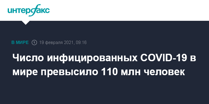 Москва. 19 февраля. INTERFAX.RU - Число выявленных случаев заражения коронавирусной инфекцией в мире с начала пандемии на утро пятницы составило 110 305 738 случаев, свидетельствуют данные американского университета Джонса Хопкинса.