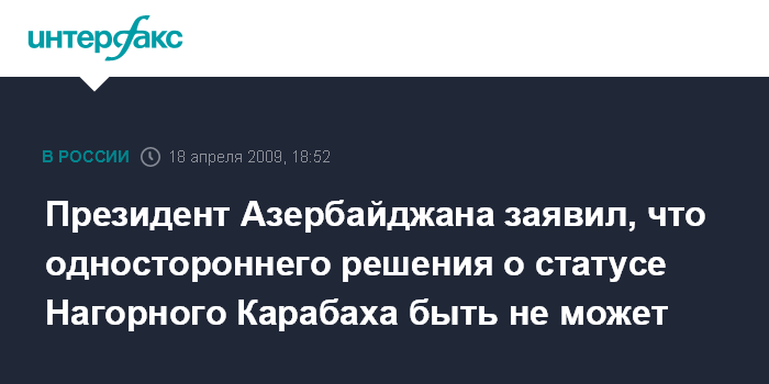 "Одностороннего решения о статусе Нагорного Карабаха быть не может. Азербайджан не видит и никогда не будет участвовать в процессах, которые бы предполагали механизм юридического отделения Нагорного Карабаха от Азербайджана. Это наша однозначная позиция", - заявил И.Алиев.