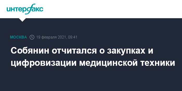 Москва. 19 февраля. INTERFAX.RU - Мэрия Москвы еще в 2019 году решила полностью обновить высокотехнологичное медицинское оборудование в городских больницах и поликлиниках и закупить 6000 аппаратов с 2020 по 2023 годы, сообщил в блоге мэр Сергей Собянин. Из приведенной им схемы следует, что на февраль 2021 года из 6000 приборов было закуплено 4800.