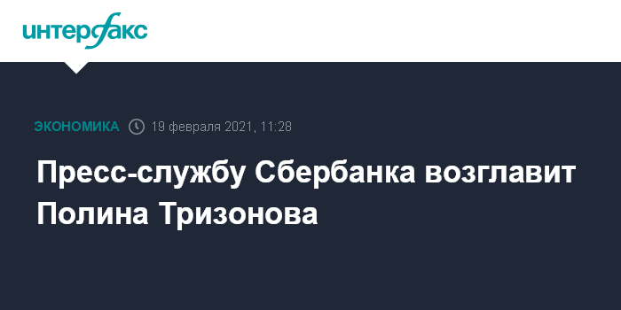 Москва. 19 февраля. INTERFAX.RU - Исполняющей обязанности руководителя пресс-службы Сбербанка назначена Полина Тризонова, работающая в группе свыше 10 лет, говорится в сообщении кредитной организации.