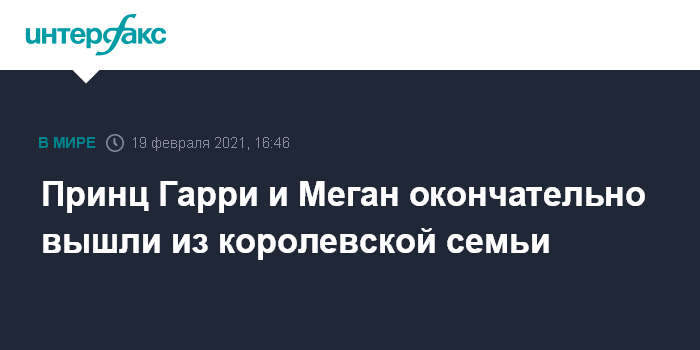 Москва. 19 февраля. INTERFAX.RU - Герцог и герцогиня Сассекские Гарри и Меган решили окончательно отказаться от статуса активных членов британской королевской семьи и от сопутствующих королевских обязанностей, сообщила пресс-служба Букингемского дворца. Как сообщает BBC News, Гарри подтвердил это в разговоре с бабушкой, королевой Елизаветой II.