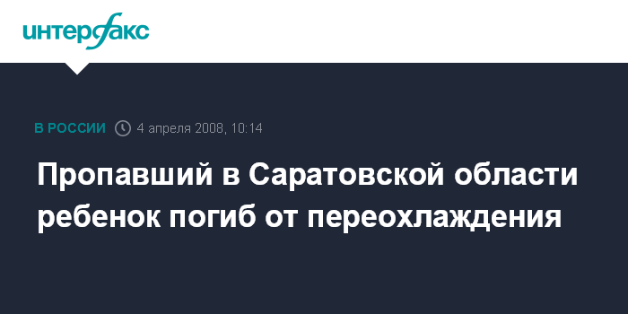 "Результаты вскрытия показали, что смерть наступила вследствие переохлаждения около суток назад. Каких-либо телесных повреждений на трупе не обнаружено. Обстоятельства, в результате которых погиб ребенок будут установлены в ходе расследования", - сообщает в пятницу Следственный комитет при прокуратуре (СКП) РФ по Саратовской области.