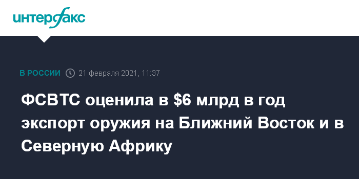 Москва. 21 февраля. INTERFAX.RU - Россия ежегодно поставляет странам Ближнего Востока и Северной Африки вооружение на $6 млрд, сообщили журналистам в Федеральной службе по военно-техническому сотрудничеству (ФСВТС) РФ.