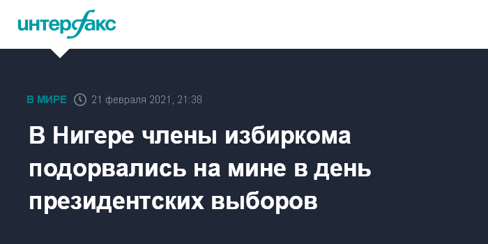 Москва. 21 февраля. INTERFAX.RU - Автомобиль с семью членами избирательной комиссии Нигера наехал на самодельное взрывное устройство и взорвался на юго-западе страны, все находившиеся в машине погибли, сообщает "Би-би-си".