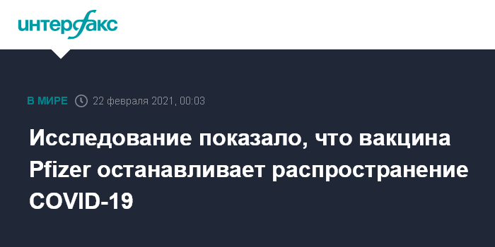 Москва. 22 февраля. INTERFAX.RU - Вакцина, разработанная фармацевтическими компаниями Pfizer и BioNTech, в подавляющем большинстве случаев предотвращает заражение коронавирусом людей, привитых этим препаратом. Об этом свидетельствуют предварительные данные обсервационного исследования массовой вакцинации в Израиле, лидирующего в мире по числу привитых на душу населения, передает Bloomberg.