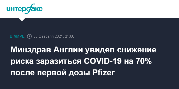 Москва. 22 февраля. INTERFAX.RU - Уже первая прививка вакциной Pfizer-BioNTech уменьшает риск заразиться коронавирусом COVID-19 на 70%, свидетельствуют данные исследования национальной службы здравоохранения Англии среди населения моложе 65 лет.